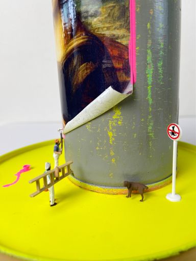 Das verbindende Element ihrer Kunst besteht im Upcyceln alter Materialien - Materialien, die bereits ihre ganz eigene Geschichte mit sich bringen. Im Gegensatz zu einer leeren Leinwand sind die vielen Gebrauchs- und Abnutzungsspuren des Turnhallenparketts oder die Kaffeeflecken auf Omas alter Tischdecke die eigentliche Inspirationsquelle für ihre Bildmotive.
