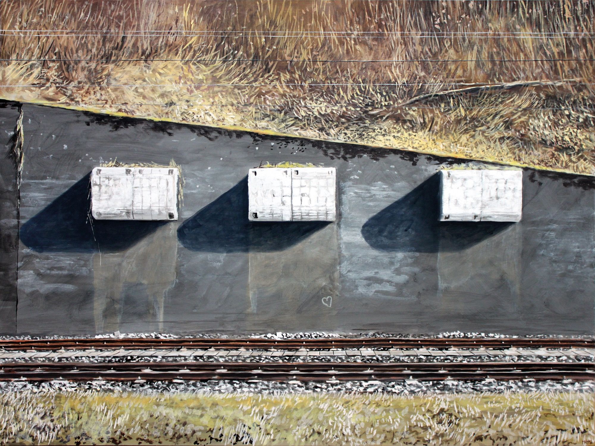 Gemälde mit Motiven zwischen Sehnsucht, Gardinen, Zuhause, Beton, Fernweh, spiegelnden Fensterscheiben, Licht und Schatten.
